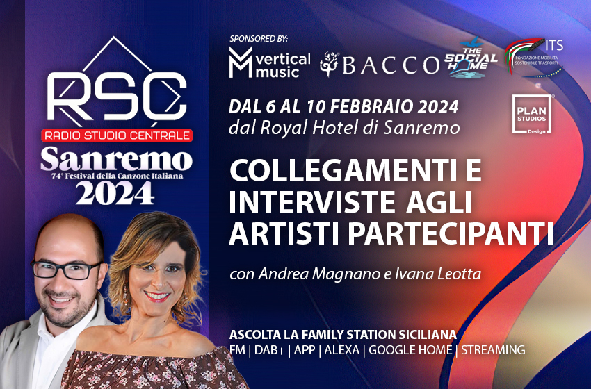 Radio Studio Centrale torna a Sanremo, in occasione della 74esima edizione del Festival canoro più amato d'Italia. RSC avrà una postazione diversa rispetto a quella degli anni precedenti e seguirà come sempre tutto il Festival, quest'anno da Martedì 06 a Sabato 10 Febbraio 2024. Inviati della radio, interviste, gossip, curiosità in diretta dalla città dei fiori. Rimanete collegati per saperne di più. Radio Studio Centrale anche quest'anno vola a Sanremo.